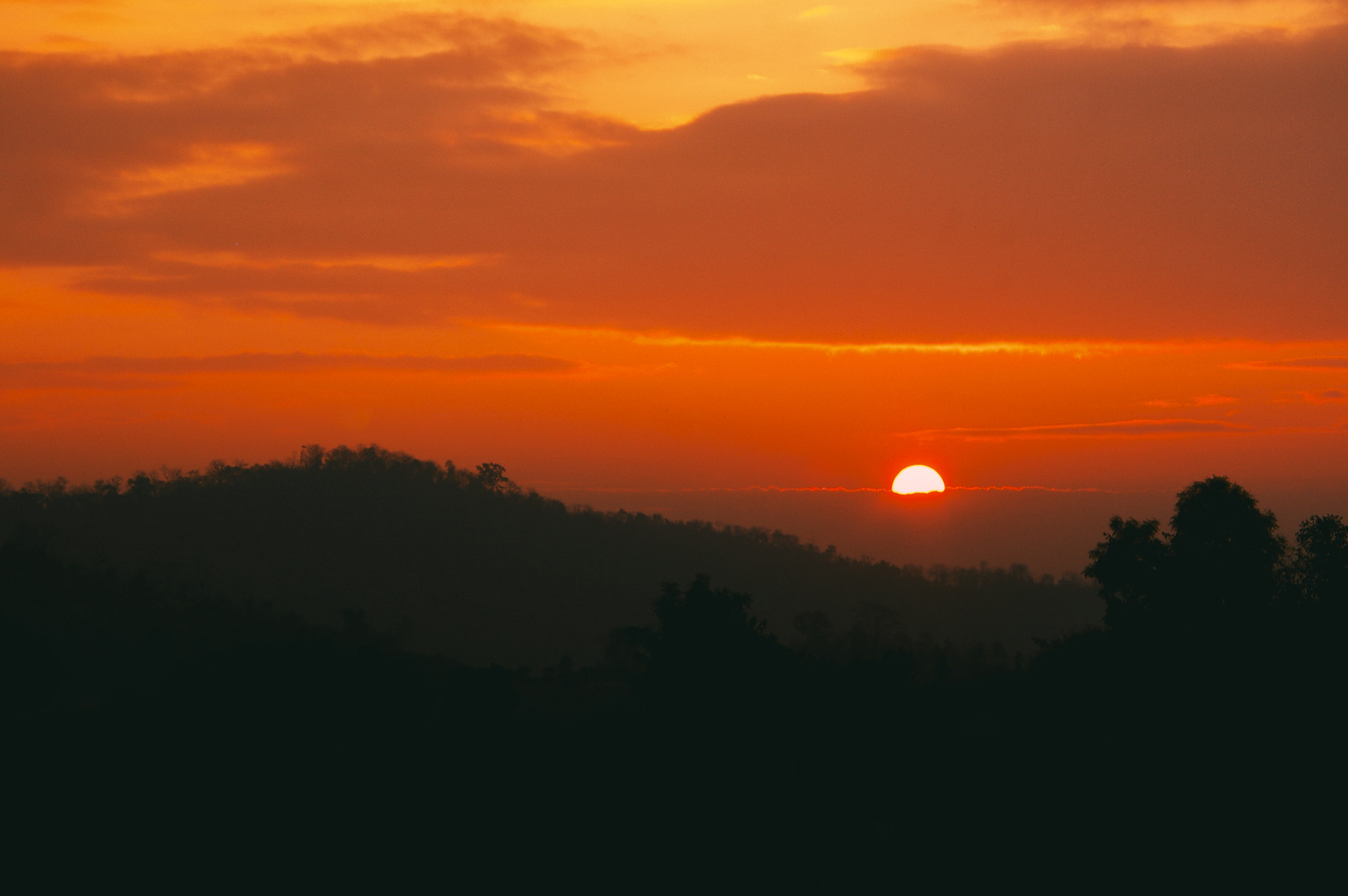 Slowly a yellow disc appears behind a streak of cloud. Orange. Pink. Red.